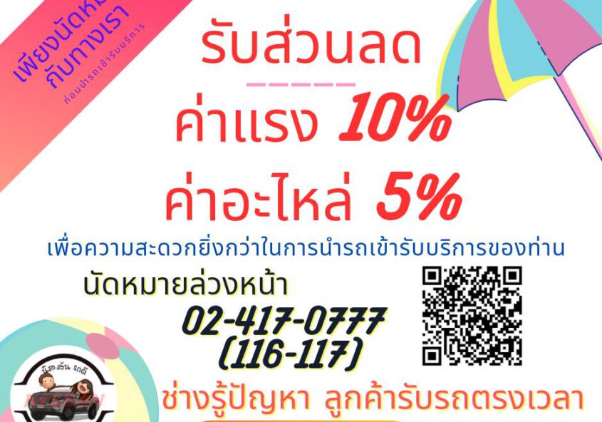 นัดหมายล่วงหน้า รับส่วนลด ค่าแรง 10% และ ค่าอะไหล่ 5%